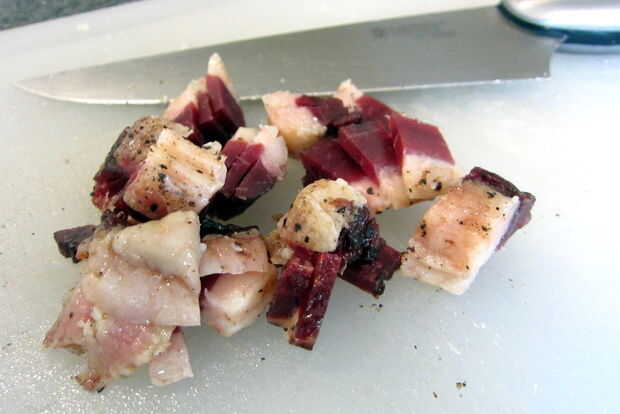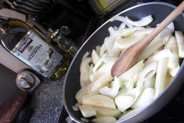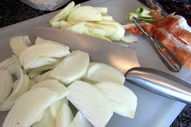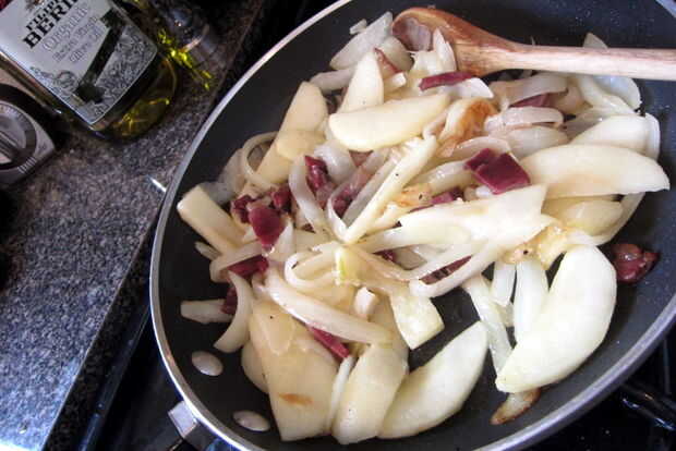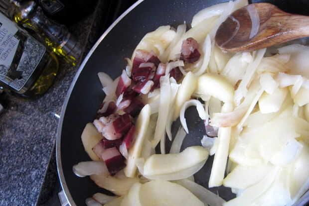 Si usas jamón, rehogar las cebollas y manzanas primero en buen aceite de oliva (un par de cucharadas), añadimos el jamón serrano al final durante unos pocos minutos agregar a la mezcla.