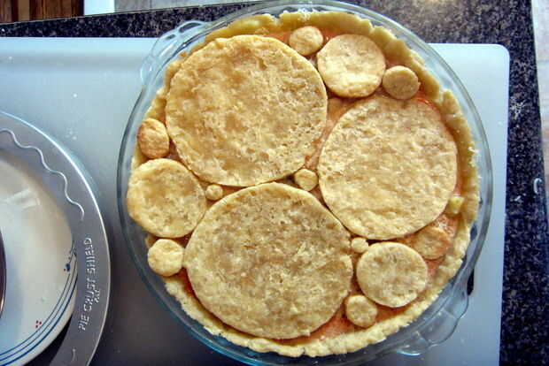 Por último, cuidadosamente organizar los círculos de masa según el patrón de empaque apolíneo que está siguiendo. Los círculos absolutamente deben tocar uno al otro y todavía pueden superponerse al borde de la empanada un poco.