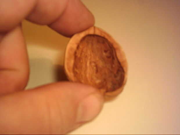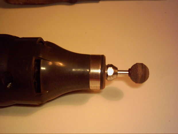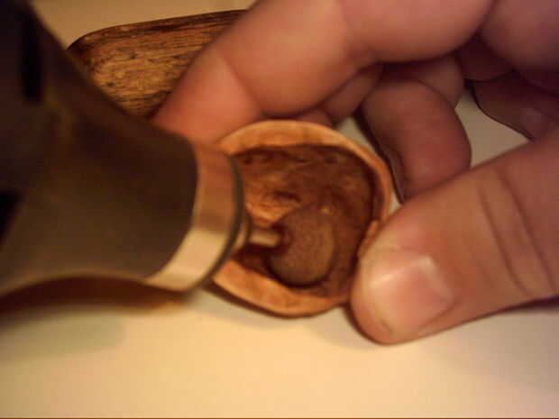 Por lo que desde aquí procedí a raspar el interior con mi destornillador, que puede no haber sido necesario, teniendo en cuenta el hecho de que la dremel es venir a jugar. Así que montara la piedra redonda que ves aquí y procedió a limpiar el interior. La nuez resultó para ser sorprendentemente resistente y la piedra no cavar un agujero a través de la cáscara como originalmente había temido. De hecho la piedra dremel limpia el interior y suave para un bueno limpieza interior, también abrió el interior así que realmente podría poner más en él.