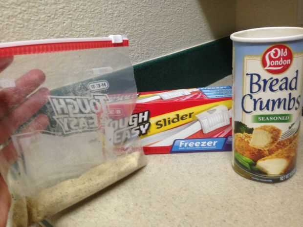 Verter las migas de pan en la bolsa hasta aproximadamente 0,5 pulgadas de las migas en la bolsa.