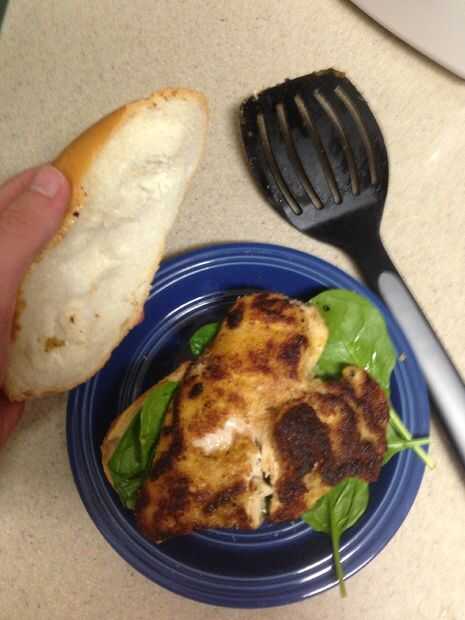 Corte el pan por la mitad. Añadir las espinacas a la mitad. Encima de espinaca, agregue el pollo cocido.