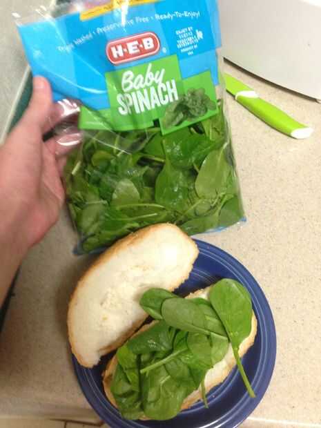 Corte el pan por la mitad. Agregue la espinaca a la mitad. Encima de la espinaca, agregue el pollo cocido.