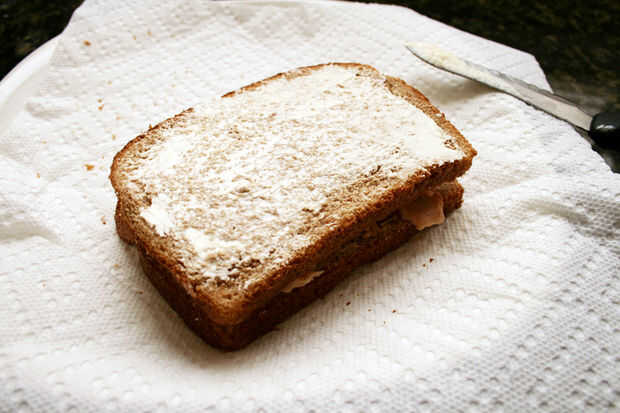 6. tapa que la espera con mantequilla rebanada alrededor para que besa la pila a su emparedado.