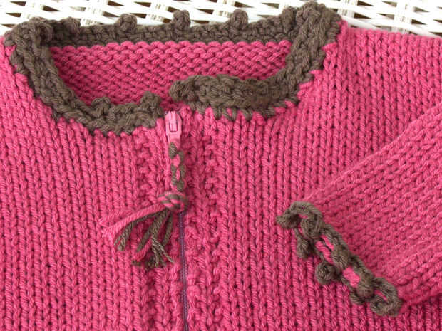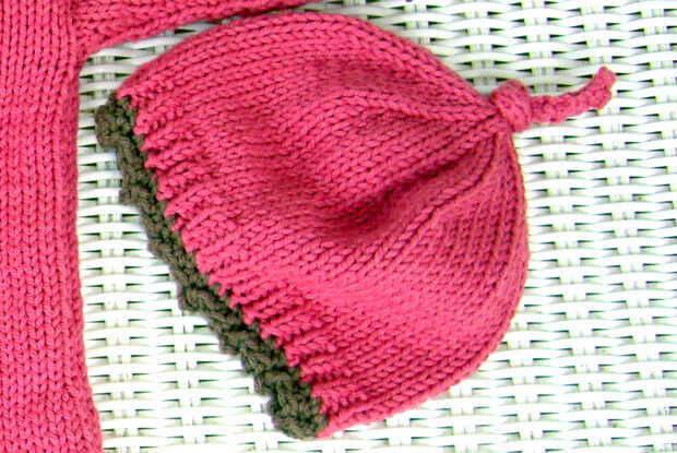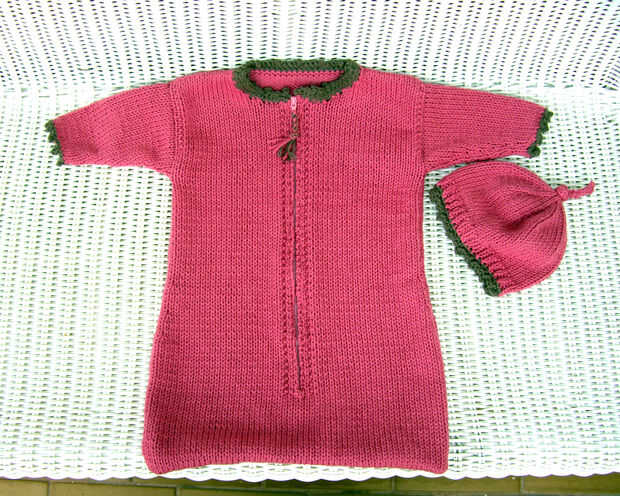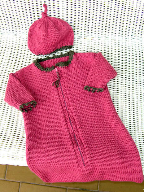 De este Escribano de bebé de algodón, usé "Facilidad de algodón" de la marca del León. Es un 50% algodón y 50% acrílico mezcla y viene en una variedad de colores fantásticos! Este empavesado sólo 2 y una mitad madejas de 3.5 oz "Baya" y había recortado en algodón "Topo". He modificado el patrón de una chaqueta normal. Usted puede utilizar cualquier patrón de suéter de hecho; sólo alargar la parte inferior y omitir botoneras. Mano-cosí el cierre incluso, utilizando puntadas amplia; no es tan difícil como pensé que sería. Asegúrese de pin, pin, pin! El ajuste fue hecho a ganchillo con una puntada de la puntilla y el resto fue tejer en Jersey con mi tamaño de aguja favorita... 7... y favorito material de la aguja... bambú. Elegí un tamaño más grande para un recién nacido permitir que el bebé lo usa con la ropa puesta. La tapa fue divertido y rápido utilizando la misma puntilla de ajuste y un nudo superior acorde para tu antojo. Su libro favorito es "El hilo de guía para niño tejidos". Este libro contiene las instrucciones básicas y varios sweaters básicos y casquillos para niñas y niños.