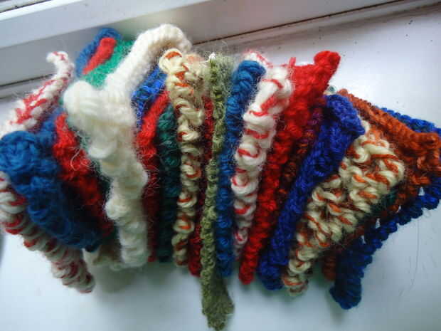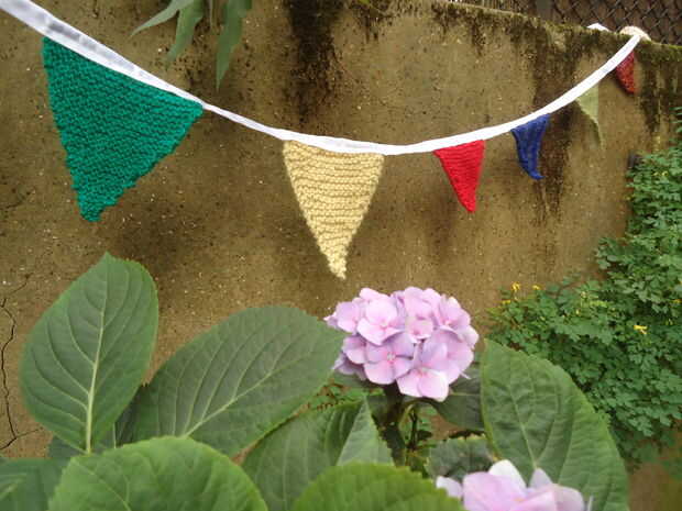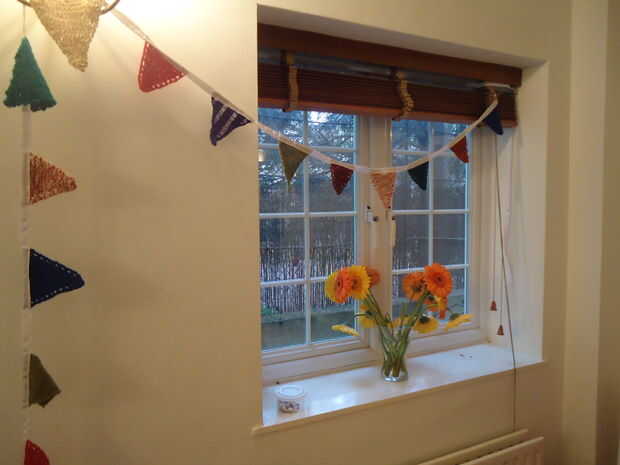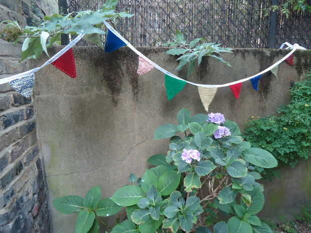 Para conmemorar esto, he decidido crear del empavesado. Mientras que tradicionalmente, las banderas se hacen de tela, con más barato menos opciones resistentes hechas de papel o plástico impreso, decidí reciclar los pedacitos de hilo sobrante de tres entusiastas tejedoras. Te una cadena larga y luego dividirse en tres partes-una para cada uno de nosotros, para decorar nuestras casas nuevas con.