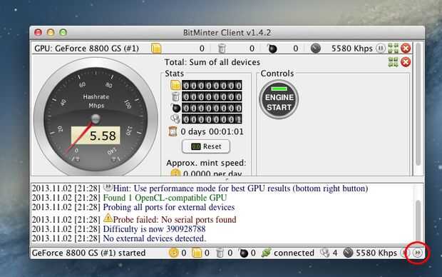 Verás el velocímetro muestra tus estadísticas de minería actual, haga clic en el icono en la parte inferior derecha esquina para entrar en el Modo de funcionamiento que es más rápido y ver los Bitcoins se suman!