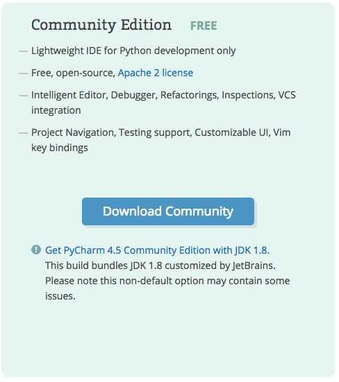 Ahora para este tutorial vamos a usar un IDE o entorno de desarrollo integrado (básicamente un editor de texto y el compilador rellenos juntos) así que dirígete a https://www.jetbrains.com/pycharm/download/ y descargue el "Community Edition" de Pycharm.