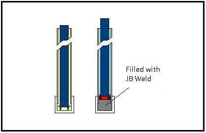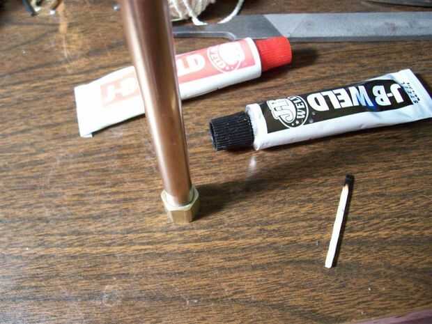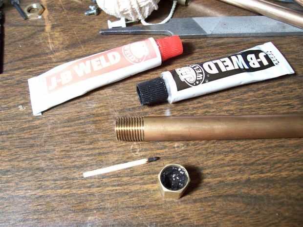 La tapa es establecida como una taza y llena hasta la mitad de "acero" y a medio camino con "endurecedor". Se mezclan con un fósforo o un palillo de dientes. Luego el pezón se mantiene vertical y el extremo inferior roscado en la tapa y apretar. Una vez apretada la tapa del pezón y al final son colgadas por un cordel o se puso de pie para el JB weld establecerá con una superficie plana y horizontal en el interior para detener el pistón y eliminar involuntario de todo espacio de aire.