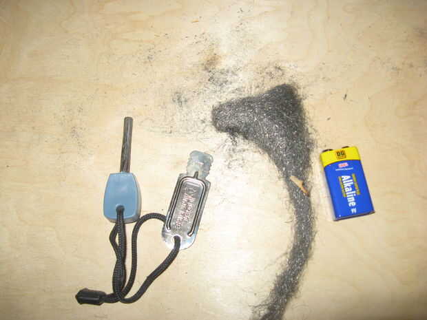 un viejo truco pero sigue siendo muy útil, simplemente utilice una batería o un palo de pedernal. Es ideal para las fogatas o incluso improvisado encendido si usted tiene necesidad de tal. se trata de fuego así que mucho cuidado