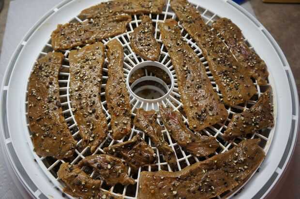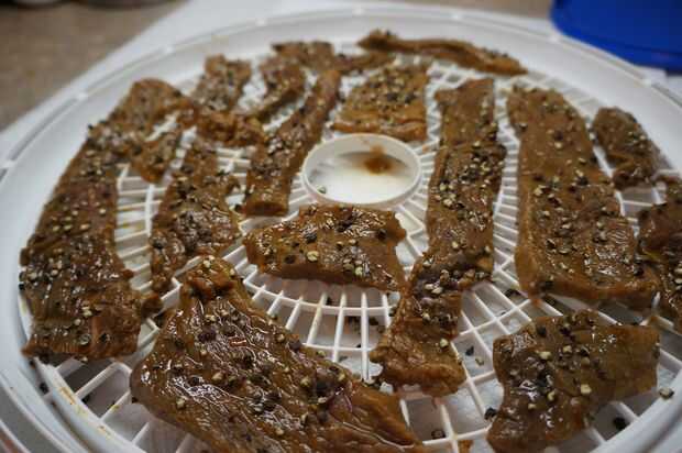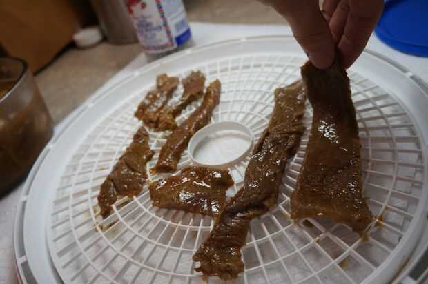 Es el momento de deshidratar! Colocar una buena cama de toallas de papel sobre una mesa o encimera y prepárate la primera bandeja. Una rebanada a la vez, retire la carne del recipiente de la marinada y coloque en la bandeja. Tenga cuidado de estirar cada pieza y evite el contacto del uno con el otro. Trate de mantener piezas tan rectos como sea posible y evitar los dobleces o agrupados por zonas. Si usted tiene un montón de bandejas entonces no obtener demasiado llevado a preocuparse por el espacio. De lo contrario, parece un gigante juego de tetris de carne y su mejor esfuerzo para maximizar la cantidad que caben en cada bandeja. Asegúrese de que dejar por lo menos algún espacio entre las piezas. Esto es importante para asegurar que el aire caliente en el deshidratador puede circular libremente.