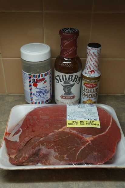 Mi esposo es un gran fan de beef jerky. Esta cecina de res es picante con un buen toque de pimienta. Compré una nalga de london broil para hacerlo. Yo también deshidrata la carne en un Deshidratador Excalibur durante 4 horas y 15 minutos exactamente.