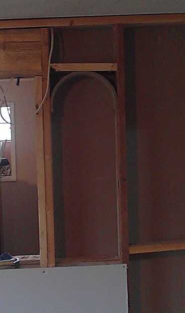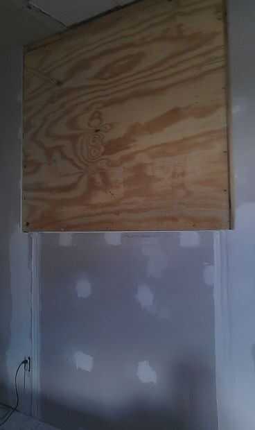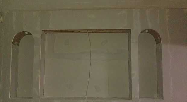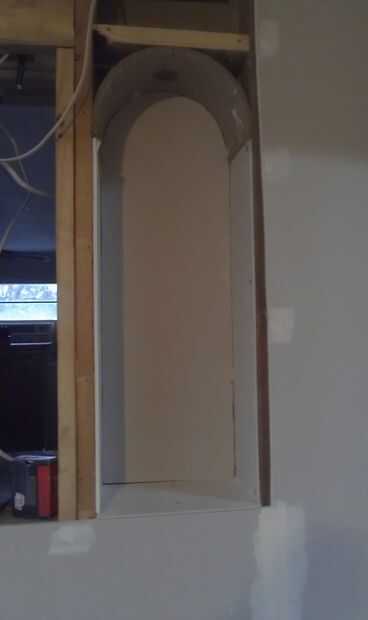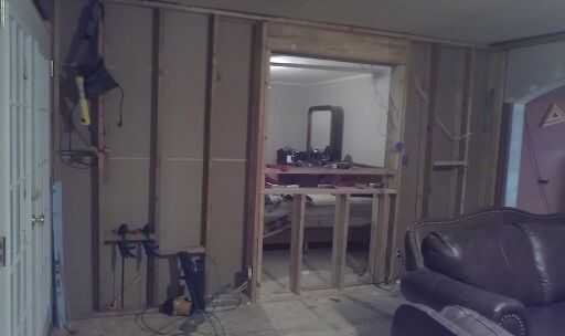 Abre la puerta de la habitación en la guarida. Me moví y enmarca el espacio. Los montantes en la pared segundo fueron construidos para que coincida con el original, perno a perno prisionero. Hice la apertura de la tv para caber un 63 en tv, incluso tho mina no es grande. En tv es un cd/control remoto estante etc.. Luego los estantes para módems de internet, cajas de cable, consolas de juegos, etc.. Antes de que drywalled los lados, tuve que hacer dos cosas. Primero tuve que taladrar dos orificios a través del ático. Bajan a lo largo de los lados a donde voy a tener luces en los rincones en los lados del tv spot y continuar hasta un enchufe para estantes grandes y otro bajan el spot de tv, para la caja eléctrica en la parte superior y cables se bajan a la tv. Necesitaba la madera dentro de la zona un poco por lo que habrá espacio para poner 1/4 en paneles de yeso sobre madera contrachapada de lado dormitorio de huésped que quede al ras con la pared. Así que muescas en el marco alrededor de la hendidura de tv 1/4 de pulgada en y hacia fuera en 1 1/2 para poder poner 3/4 en madera dentro de la zona con muescas y colocar. (La madera contrachapada deberá hacer el montaje de la tv) He hecho inserciones en la madera contrachapada y poner los tornillos para el montaje, para que sea al ras contra la pared. A continuación pongo yeso en los interiores. Había enmarcado las cajas para mis rincones en el lado del spot televisivo. Yo quería Arco usé 1 en rollos de cartón gruesos (la clase tubería viene envuelta alrededor), cortarla del tamaño y cortar por la mitad. Drywalled, fango y graba todo.