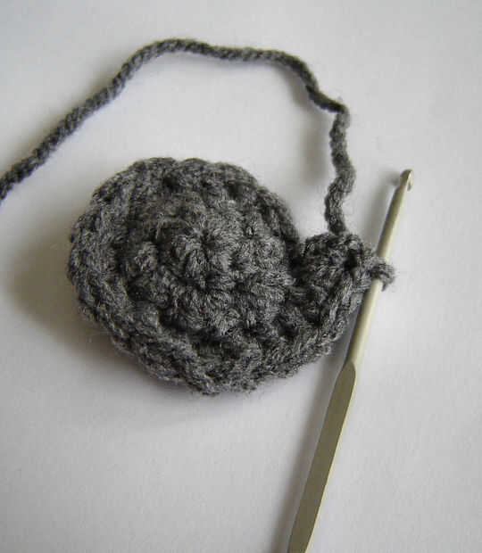 R3: CH1, sc en la calle siguiente, 2sc en st siguiente; repito, sl st en la primera puntada (18)
