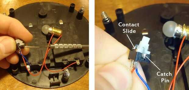 Hay dos cosas a notar sobre el interruptor. La primera es el pequeño pedazo de metal contacto que se desliza arriba y abajo cuando el interruptor se empuja. Si sale esta pieza, el interruptor no funcionará a menos que se puede encontrar y volver a colocar. El segundo es un perno de metal en la parte frontal del interruptor. Es este pin que causa el interruptor de bloqueo en el estado cuando se empuja, y es este pin que necesitamos eliminar.