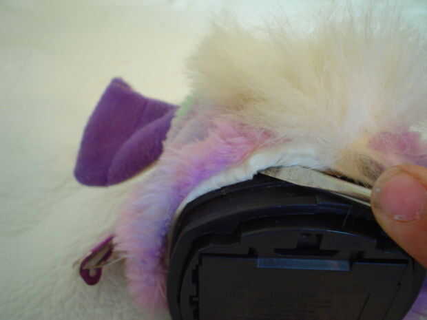 Ahora usando el destornillador plano otra vez, empuje la brida hacia atrás abajo en él ha del surco de la misma manera te la quitó. Trate de conseguir uno de las esquinas traseras primera y trabaja su manera alrededor de la parte delantera. Tenga cuidado de no torcer el pelo alrededor de la brida mientras empuja en su lugar, por lo que no se verá distorsionada su furby. Una vez que usted consigue en su ranura y todo se ve bien, deslice orejas de Furby en el esqueleto, haciendo una nota del agujerito en el esqueleto y su posición.