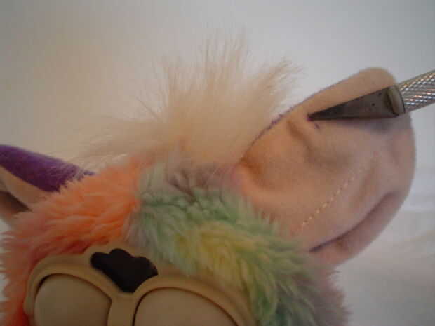 Con un cuchillo de la manía aguda como un X-Acto #11, cortar los puntos de sutura que unen orejas de Furby al esqueleto según la foto. Entonces suavemente deslizar las orejas. No necesita quitar los oídos del cuerpo, sólo las partes móviles del esqueletos. Una vez que las orejas son sueltas, retire el hilo extra que sólo se cortan desde la parte posterior de las orejas suavemente trabajando suelto y hacia fuera.
