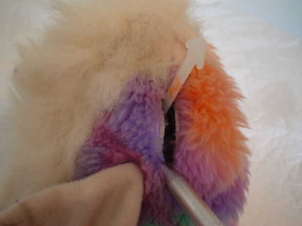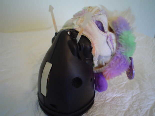 Hay dos "ganchos de plástico" que espera piel de Furby, uno debajo de cada ranura del oído. Sólo pellizcar la piel y tire hacia abajo hasta que se desengancha y viene gratis. El mango del cuchillo se utiliza sólo como un puntero en la foto, no utilice una herramienta para desenganche! Una vez que la piel está libre de ambos lados, levante suavemente el anillo de lazo zip sobre las orejas, da vuelta adentro hacia fuera como vas. Tenga cuidado de no romper las orejas de plástico! El furby debe terminar como el que está en la segunda foto de este paso. Ahora con cuidado quite la placa frontal. Debe venir de fuera, es celebrada con pegamento caliente. Eliminar cualquier residuo de pegamento extra de la piel y el cuerpo.