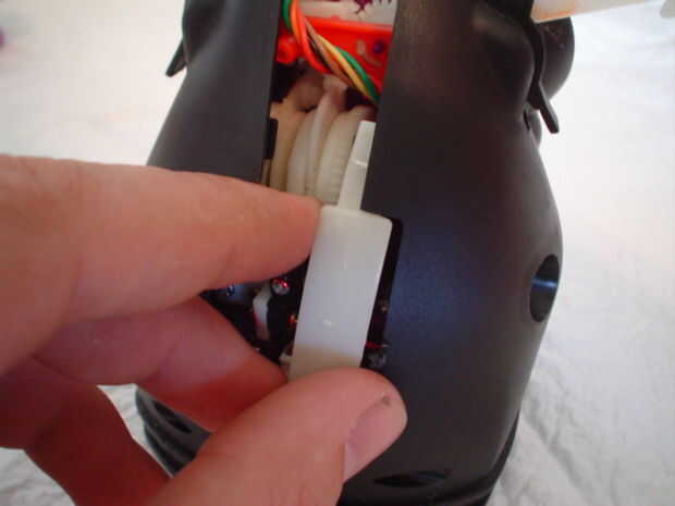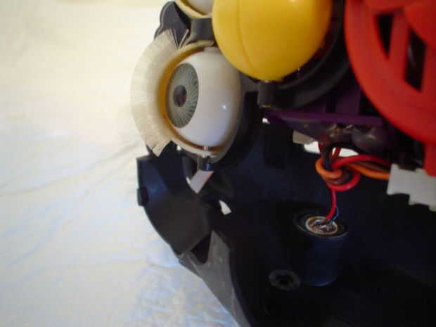 Ahora que Furby está despierto, darle tiempo para recuperarse mientras observa su funcionamiento motor. Increíble ¿no? Tan divertido como es de ver, necesita dejar que Furby a volver a dormir, dejarlo reposar un rato. Ahora que Furby está dormido, suavemente recogerlo recto y lo mantiene vertical, retire el tornillo que sostiene la tapa de las pilas y abra la tapa. No intente despertar Furby! Ahora retire una batería para no despertar durante el proceso de montaje. Si usted quita la tapa izquierda (sé que lo hiciste) bloquearla suavemente deslizándose el oído a través de la ranura y alineando los agujeros de tornillo. Inserte los dos tornillos que tiene en su lugar. Ahora inserte la oreja derecha a través de la ranura del oído de la cubierta derecha. Ahora coloque la tapa sobre la mesa y suavemente empuje hacia atrás el micrófono en su soporte. Luego inserte el actuador de masaje en la espalda en la ranura de la cubierta derecha. Sube la lengüeta larga del actuador. Ahora Alinee el actuador a la cubierta izquierda colocando la cubierta derecha en el Furby. En la última foto en este paso se muestra la alineación apropiada. Una vez que todo está en la alineación, inserte los cuatro tornillos que sostiene la tapa en su lugar.