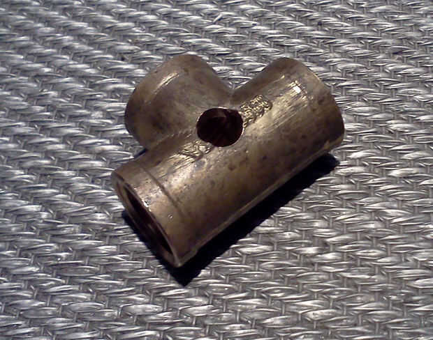 Para construir el montaje para la rueda delantera que tenía que perfore un agujero piloto a través de los tubería-tees, luego aumentar a 10mm (siendo el diámetro del eje de metal sólido. Una vez hecho esto he podido quitar los árboles de la parte posterior de cochecito por simplemente sacar una de las arandelas y deslizando hacia el otro lado. A continuación inserta esta varilla a través del agujero en el te de la pipa y montar la arandela en el otro lado.