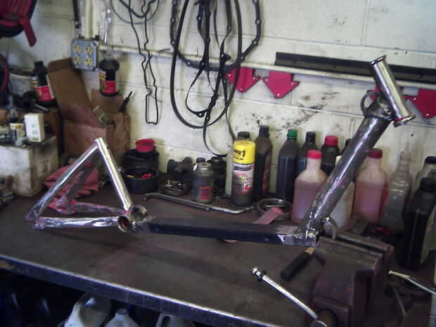 Paso 1: a partir de una vieja bicicleta - tira todos los extras (roturas, defensas, caballete etc..)Paso 2: una vez que tengas la moto desnudo huesos Quite todo pero el triángulo traseroPaso 3: utilizar un neumático auto cuerpo sierra o sierra para m