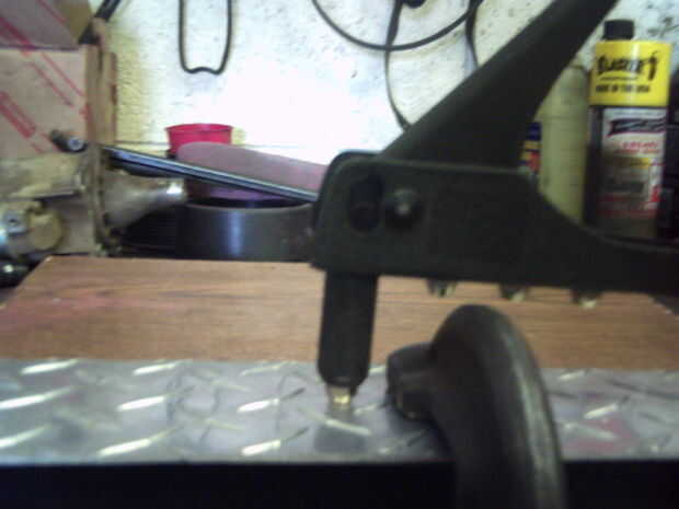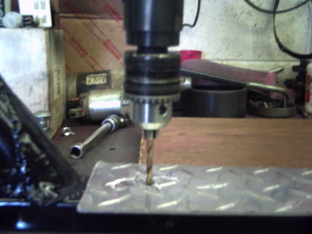 Algunos chatarra aluminio diamind placa conectar el tubo de la parte inferior con un pequeño ajuste y fue unida con unos remaches pop. Mi hijo le gustaba la mirada de la vieja rueda dentada cigüeñal solía el soporte del reflector asiento post Coloque el piñón en el tornillo de fijación de barras de la manija.