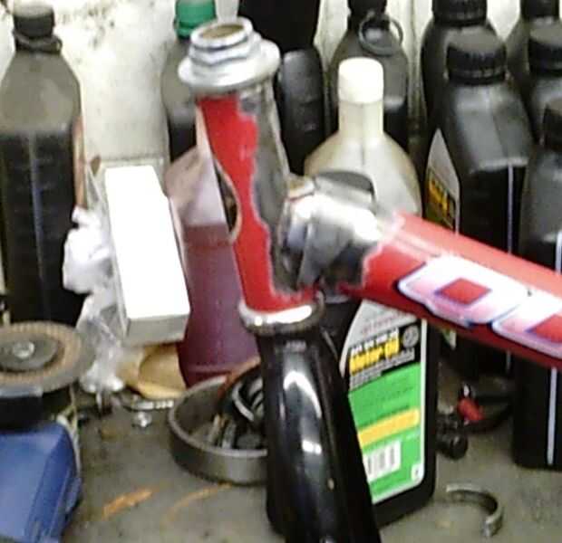 Hay algunas lagunas en la parte superior y parte inferior del tubo hacia abajo que llena y consolidado. Tomar el tubo superior que se corta antes y cortar algunos trozos en forma de cuña. Limpie la pintura y coloque en su lugar. Corté en medio algunos descartados Tacoma eje trasero rodamiento retenedores para refuerzos. Para agregar fuerza adicional bottome del tubo hacia abajo y las cosas limpiamos un poco, que corta un cono de helado forma de algún retal 18 calibre del metal de hoja.