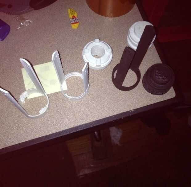 Tomé las algunas imágenes del show y escala de las imágenes por lo que la empuñadura era alrededor de 10" de largo, basé entonces todas mis medidas en eso. Modelo de las piezas por lo que podrían deslizarse en un tubo de pvc de diámetro de 1", luego tuve las piezas 3d impreso.