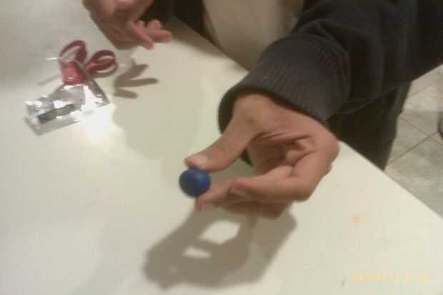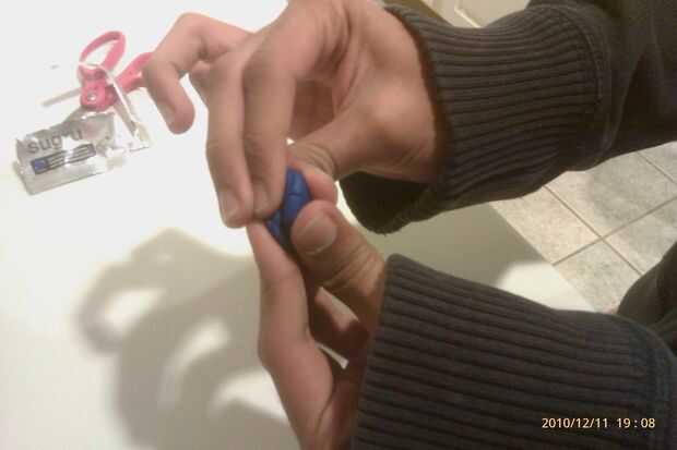 Haz tus tijeras y corte en la línea punteada. Saque todos lo sugru asegurándose de que no hay nada en el contenedor. Empezar a amasar la mezcla y hacerla maleable. Rollo en sus manos una bola. (Nota: tus manos Haz manchadas con el color de sugru por lo que no sugiero trabajar en algo que quieras mantener limpio).