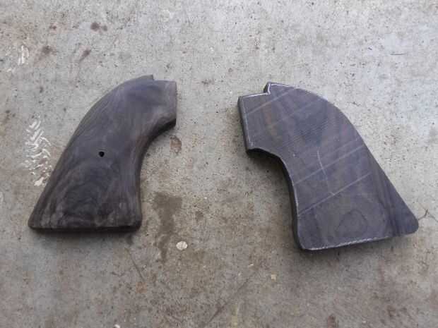 La mayoría de revólveres tienen muescas que permiten a la mano para sostener el arma. Antes de iniciar que forma el mango, coinciden los agujeros en la empuñadura de la pistola y taladrar los agujeros para que coincida con, luego taladre el agujero principal en el centro para el tornillo del centro. Una vez que tenga los orificios perforados (no hecho en esta foto) que forma el mango al principio con madera archivos luego una vez la forma de inicio es donde usted la quiere comienzo a lijar para conseguir liso.