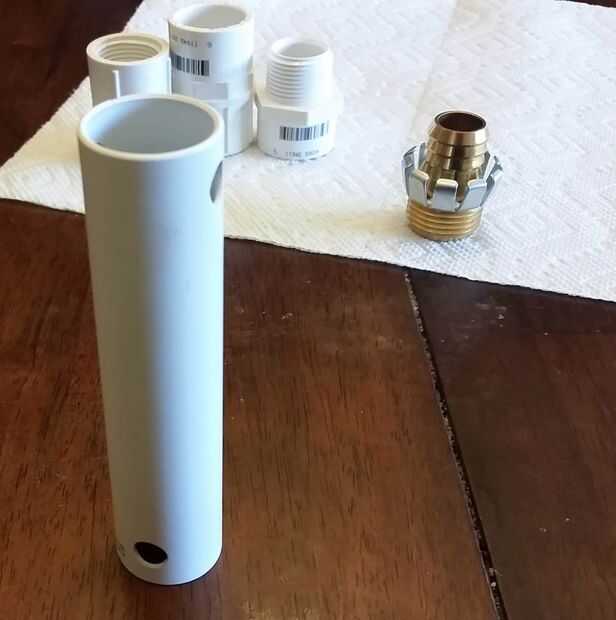 He comprado piezas de Home Depot y ACE Hardware. No escribo los nombres de las piezas que tengo, así que los nombres son aproximados. La parte más larga del proyecto estaba mirando a través de las instalaciones de tuberías de PVC y buscando combinaciones interesantes que encajan entre sí. Probablemente estuve 1 hora en piezas entre las dos tiendas.