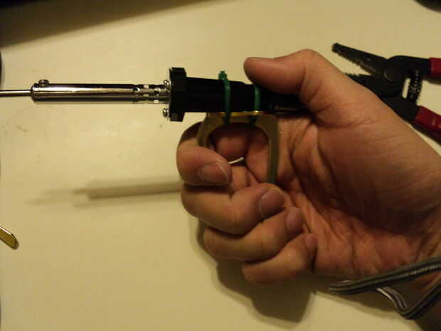 Fije un gancho de percha en la parte superior del soldador. Pasar un cintillo a través de los orificios de tornillo en el gancho de la percha y envolver el cuerpo del soldador. Utilizar un segundo tie-wrap para asegurarlo y mantenerlo de una torsión sobre.