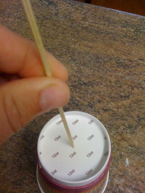 Usando el tuyo puntiagudo agudo, meter un pequeño agujero en el centro de la parte inferior de la taza.