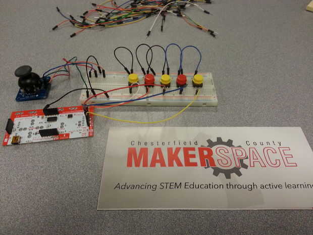 Esto hace fácil de conectar una variedad de interruptores y palancas de mando para el MakeyMakey que luego puede enviar varias pulsaciones de tecla simultáneamente a un ordenador o estación de robótica en coche. Se utilizó la configuración de tablero del prototipo anterior para probar velocidades de respuesta y para comenzar la programación necesaria.