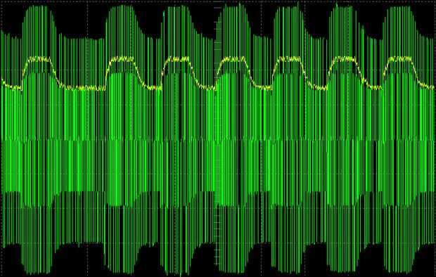 Línea amarilla: señal modulada a la salida del detector de envolvente