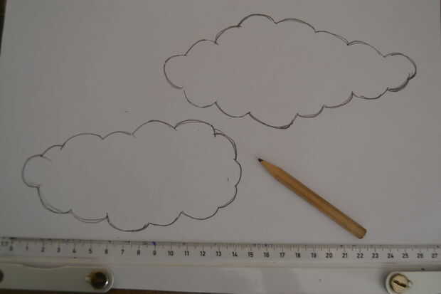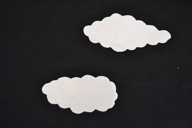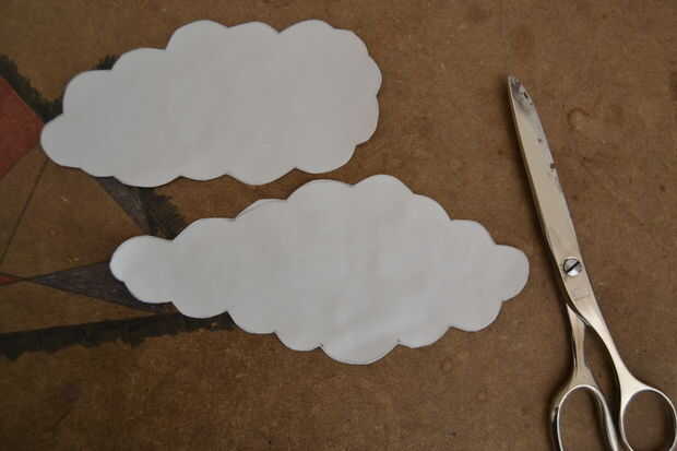 recorta las plantillas de papel y utilizarlas para cortar dos formas de nube fuera de la tela blanca. ya que has de marcar las nubes en el lado izquierdo de la tela tienes que voltear las plantillas de papel antes de marcar las formas, para que las nubes aparecerán más tarde en la bolsa como dibujé.