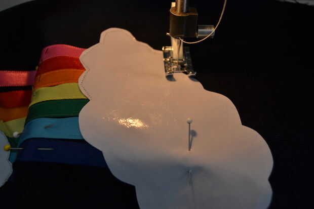 coser las nubes a la tela. lo mejor coser realmente lento, es porque tienes que seguir todas las curvas de las nubes y coser con cuidado cerca del borde de la nube. También asegúrese de que las cintas arco iris permanecer en el lugar.