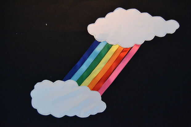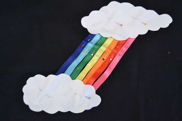 tomar las cintas de raso y los ponen en la posición que guste, luego pin nubes y cinta del arco iris a la tela.