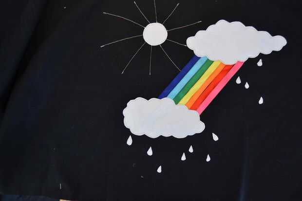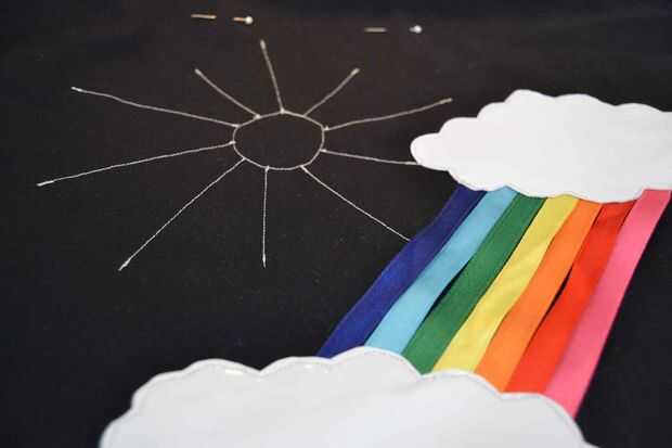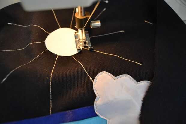 comencé por coser el contorno del sol y los rayos sobre la tela, después de que recortar un círculo de tela blanca y coser en así.