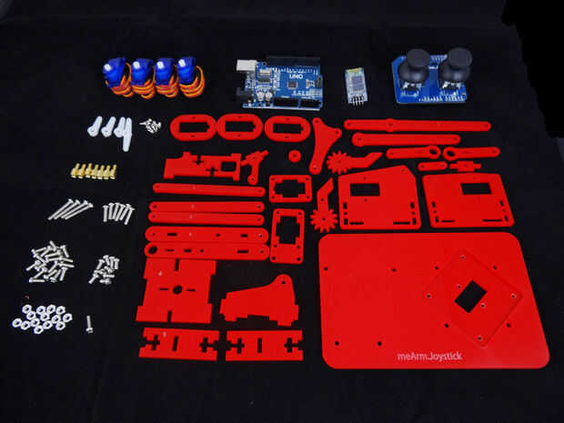 Este proyecto se deriva de bolsillo tamaño de brazo de Phenoptix de Robot.此專案源自於此, 但我加上搖桿和教程, 希望對大家有幫助.software de 30 lecciones (C/S4A/Ardublock) .30餘堂軟體課程在此 (C/S4A/Ardublock) .若要洗搖桿擴展板, 有附Eagle原始檔, 若要自行雷切, 請下載附件PDF, A4尺寸壓克力板即可. de 3mm 選擇 本 也附 BRICOL