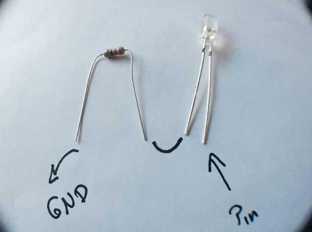 Para conectar los leds del heno de usar una resistencia 330 Ohmns, para cada uno. En este instructable puede aprender un poco más de los leds y como se conectan. Como se muestra en la foto conectamos los leds y de la pata negativa a la de resistencia y de esta tierra. Cada led se conecta a un pin diferente. En este caso conectamos el verde al 2, de rojo de el amarillo al 3 y el 4.