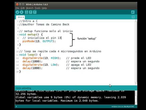 La función "setup", en la foto está entre las líneas 5 a 8, se ejecuta al arrancar el Arduino, y sirve para inicializar pinos, variables y algunas otras cosas. Corre solamente una vez. Más adelante haremos un ejemplo para esto quede más claro.