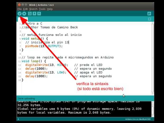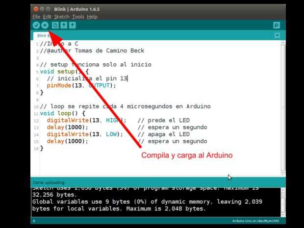 Para compilar, presionar el botón del código. Si todo venta bien, el código se carga en el arduino, y el IDE de Arduino les indica: