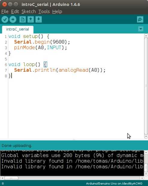 void setup(){ Serial.begin(9600); pinMode(A0,INPUT); } void loop(){ Serial.println(analogRead(A0)); } Configuración en el simplemente inicializamos el puerto serie una transmisión de un velocidad de 9600, y establecemos el pin A0, se utilizará para entrada.