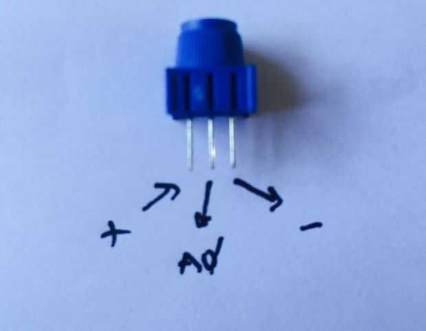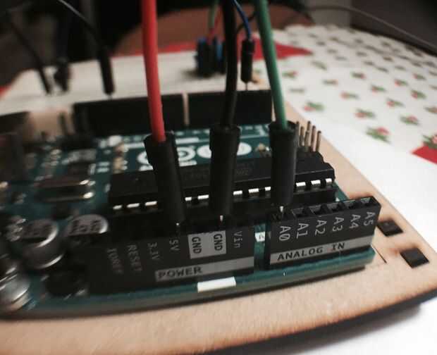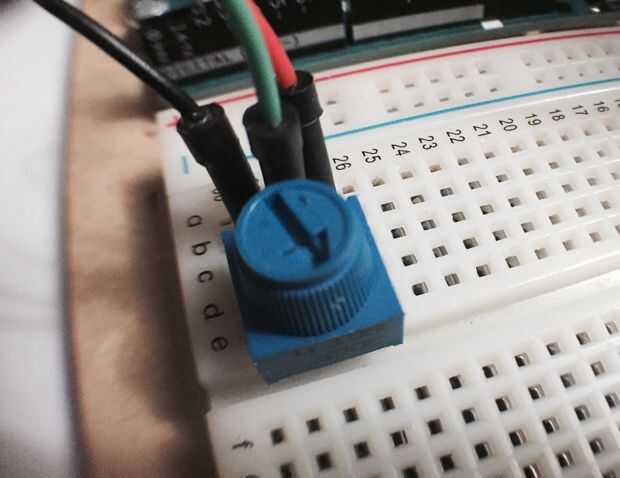 Las conexiones de entradas analógicas se hacen a través de los pines A0 a A5. En este caso conectamos el potenciómetro como se indica en la foto. La pata izquierda un 5V, y la derecha un GND. La del centro al pin A0.