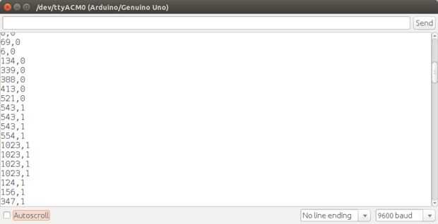 Cargar el código y abrir el monitor serie del arduino. Como verán, al mover el pontenciómetro obtenemos valores van desde 0 a 1023, y al apretar el botón se verá el valor 0 o 1.