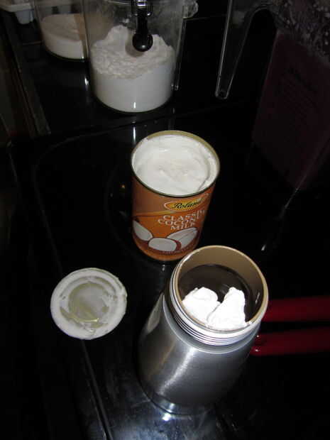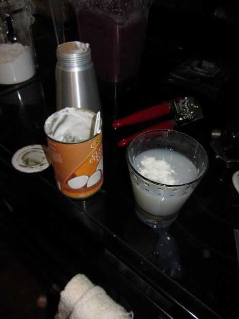 Tomé la crema espesa de la tapa de la lata en la nevera y había raspado en mi máquina de crema batida. He dejado la mayoría del agua en la lata y como había empujaban un poco la lata allí era una buena cantidad de crema en la can, y derramé el agua para descansar. He añadido 1/2 cucharadita (una pizca) de azúcar glass a la nata entonces cargada mi lata. Pensé que la crema de coco sería necesario para estabilizar el azúcar en polvo pero con la batidora no creo que lo hizo. La crema salió bonito y grueso y era muy estable (sosteniendo mejor que nata normal, pero entonces mi crema de coco era muy gruesa). Creo que mientras no agregue una tonelada del agua de coco la nata debe ser bastante indulgente.