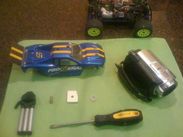 Los materiales que usted necesita, por todos los medios son una Radio controló el coche con carrocería desmontable. En este caso usé un carro de RC 1/18, se necesita un tornillo universal de la cámara, usted puede sacar de un trípode. También necesita arandelas o lámina de pvc para sujetar la cámara en el techo del camión.