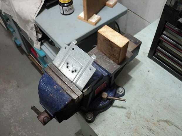 Un monitor trashed proporciona los principales elementos de apoyo para este proyecto. Quité la placa de montaje de la cubierta trasera, ahorro todo el hardware pertinente y lo llevé a mi tornillo de banco para una rápida sesión de flexión poco. Sujeción aproximadamente 1/3 hacia abajo desde la parte superior y usando un bloque de madera a soplar suavemente la pieza de trabajo, condujo la placa en un ángulo de 30 grados de unos ojo con cuidado y montar a la base del pedestal.