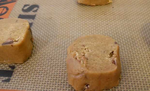 - Lugar cucharadas de masa de galletas forrada o silicona con OR cuidadosamente saque los registros de la masa y cortar 1/2 a 3/4 de pulgada rodajas y place en alineado galletas