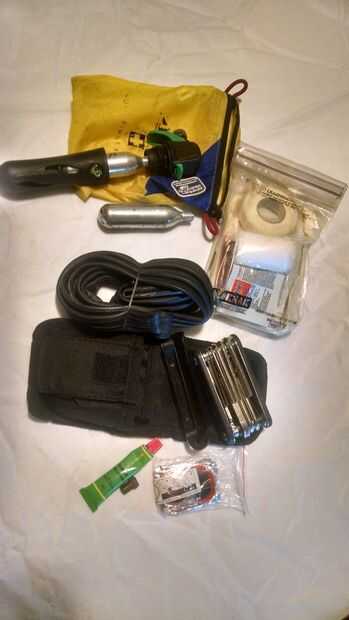 En la bolsa de sillín mantener lo esencial que ir a donde mi moto hace. Ir al trabajo o ir para un paseo largo, tener la capacidad para enmendar un piso y arañazos/moretones o lesiones. En la bolsa: